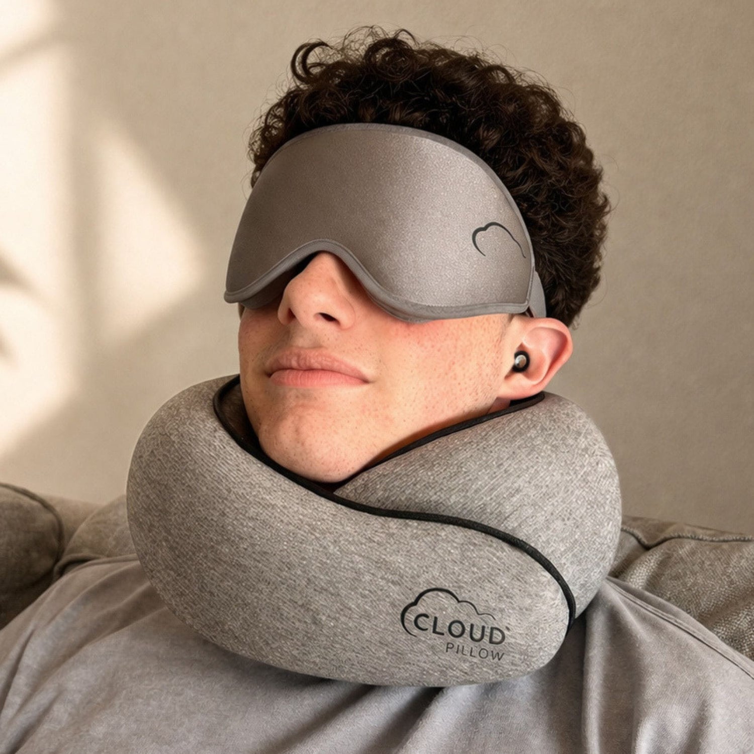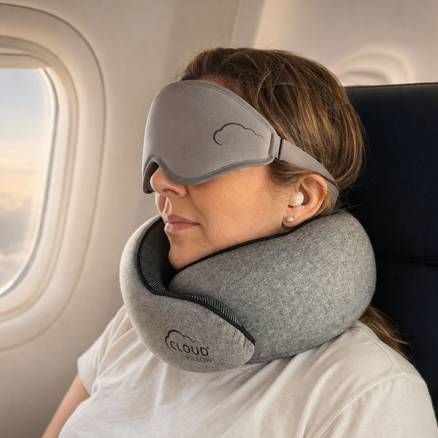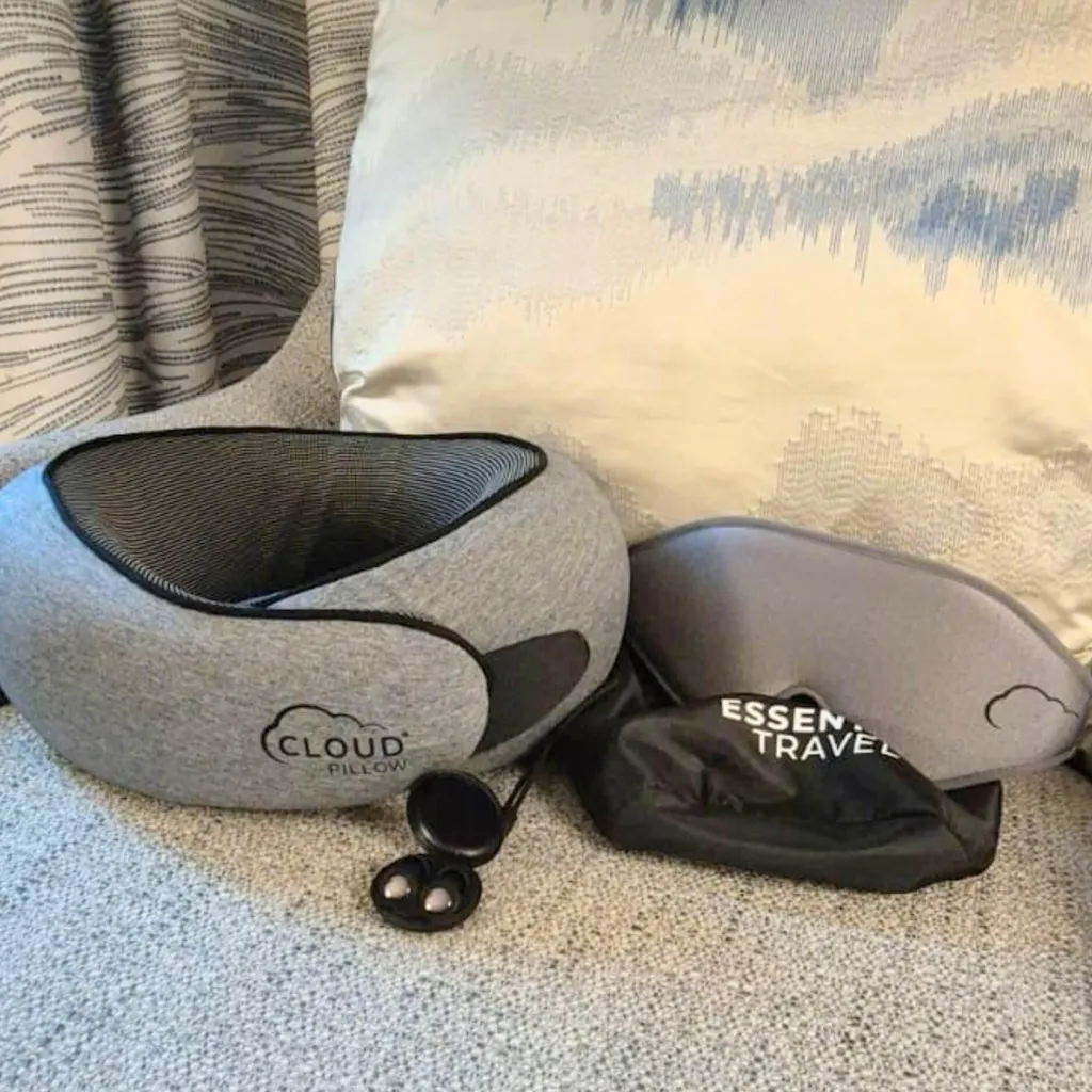 Incluye la almohada de viaje Cloud Pillow™, junto con su bolsa de transporte, un antifaz de descanso premium y reductores de sonido.